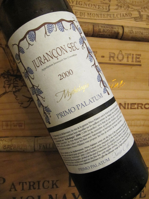 Primo Palatum, Jurançon Sec „Mythologia”, AOC, 2000 (foto 4)Vůně je neskutečně elegantní, lehce nazrálá, plnější a intenzívní, podmanivá a vyvážená, minerálně-ovocná (mandarinky, citrusy, tropické plody) s dotekem medu a bylin. Chuť dokonale navazuje, jde více do medu, a přesto je totálně suchá. Víno má pevnou a přesnou strukturu, je ideálně šťavnaté, harmonické a chuťově dokonale vyvážené, má plnější až plné tělo a dlouhou perzistenci. Velké víno a velké překvapení. Geniální kousek v lahvové zralosti. Vyrobeno pouhých 1.200 lahví.