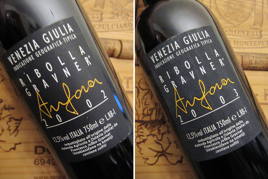 Ribolla Amfora, IGT, 2003 (foto 6b)Vůně je vyzrálá, poměrně intanzívní, plnější a živá, vyvážená, minerálně-ovocná (sušená pomerančová kůra, meruňky), s dotekem pampeliškového medu a sudem na pozadí. Chuť dokonale navazuje. Víno má pevnou a přesnou strukturu, je krásně šťavnaté a docela srovnané, na plech suché, v těle plnější, s delší až dlouhou perzistencí s hořčinkovou dochutí. Lépe pitelné než předešlé. Teplý a suchý rok a zároveň první, kdy u Gravnerů všechny hrozny kvasily v amforách (11 měsíců celkem).