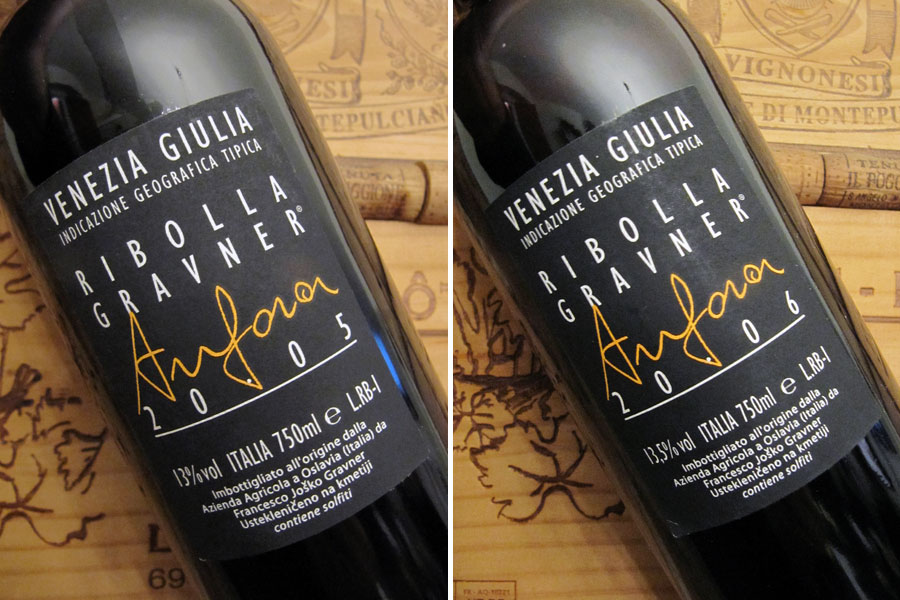 Ribolla Amfora, IGT, 2005 (foto 7a)Vůně je nazrálá, lehce oxidativní, středně intenzívní a plná směsice jeřabin, mokrého spadaného listí, rozinek a bylinných extraktů s dotekem karamelu a vlhkého dřeva. Chuť dokonale navazuje. Víno má pevnou a přesnou strukturu, je hodně šťavnaté a celkem srovnané, extrémně složité, nepřístupné a složitě uchopitelné, v těle plné, s dlouhou perzistencí. Zvláštní víno vyžadující zvláštní přístup. Nepoddajné, s obrovskou silou, která ale nemá jasně dané směřování. Přitom z vynikajícího ročníku (RP 90). Hmm. Minimálně 5 měsíců v amforách.