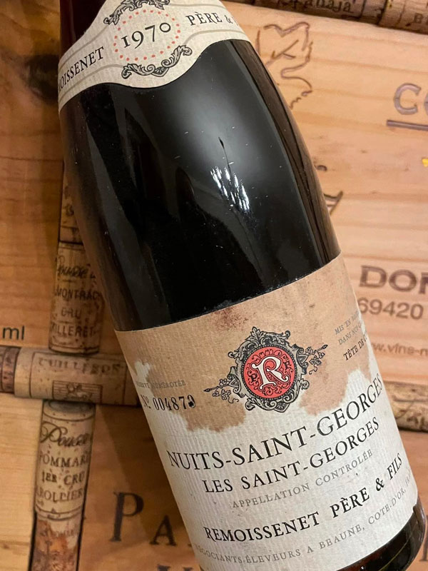 Remoissenet, Nuits-Saint-Georges 1er Cru „Les Saint Georges“, 1970 (foto 3)Nejlepší poloha v NSG, nachází se cca uprostřed jižní části apelace. Vůně je plná až hutná, koncentrovaná, intenzívní a podmanivá, krásně nazrálá a vyvážená, minerálně-ovocná (třešně, višně, peckovina), s citelnou kořenitostí, tóny podzimu (čaj, podhoubí) a podtextem sudu. Chuť navazuje, jde více do čajů a podhoubí. Víno má pevnou a přesnou strukturu, je krásně šťavnaté, koncentrované a nazrálé, harmonické a jemně texturované, v těle plnější, s vyššími hladkými taniny a delším až dlouhým závěrem. Parádní představení 52letého vína, byť postupně trošku vadne.