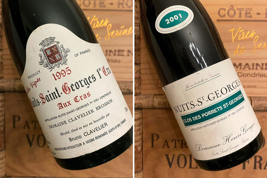 Bruno Clavelier, Nuits-Saint-Georges 1er Cru „Aux Cras“ VV, 1995 (foto 4a)Maličká vinice v severní části oblasti, jen Aux Boudots ji dělí od Vosne-Romanée. Vůně je plná, intenzívní, koncentrovaná, lehce nazrálá a vyvážená, minerálně-ovocná (jahodový kompot, třešně, peckovina), s lehkou zemitostí, kořením, čajovými tóny a sudem na pozadí. Chuť navazuje, přidává se citrusová linka. Víno má pevnou a přesnou strukturu, je krásně šťavnaté, výrazné a harmonické, v těle plné, s vysokými vyzrálými ovocně-zemitými taniny a dlouhou perzistencí. Krásné víno v super kondici i věku.